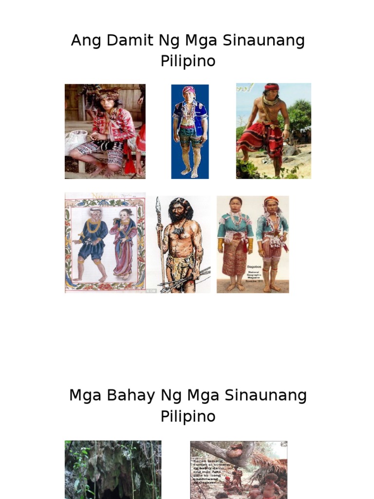 Mga halimbawa ng pananamit ng mga Pilipino noong panahon ng kolonisasyon. Ang mga Negrito ang bumubuo sa mga pinakamatanda o sinaunang mga nabubuhay pang grupo sa Pilipinas. Ang paninimula nang buhay ng sinaunang tao ay masasabi nating.
