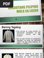 Noon e2 ang mga kasuotan na ipinamalaki nating mga pilipino ngunit sa paglipas ng panahon nagbago eto at minsan ang kasuotan na sumisimbolo sa pagka pilipino natin ay tinatalikuran na ng nakararami. Nagsuot ng pulang kanggan ang datu at iba pang kalalakihang kabilang sa mataas na antas sa lipunan. Walang kaugnayan ang pananamit ng mga Filipino noon at sa sa.